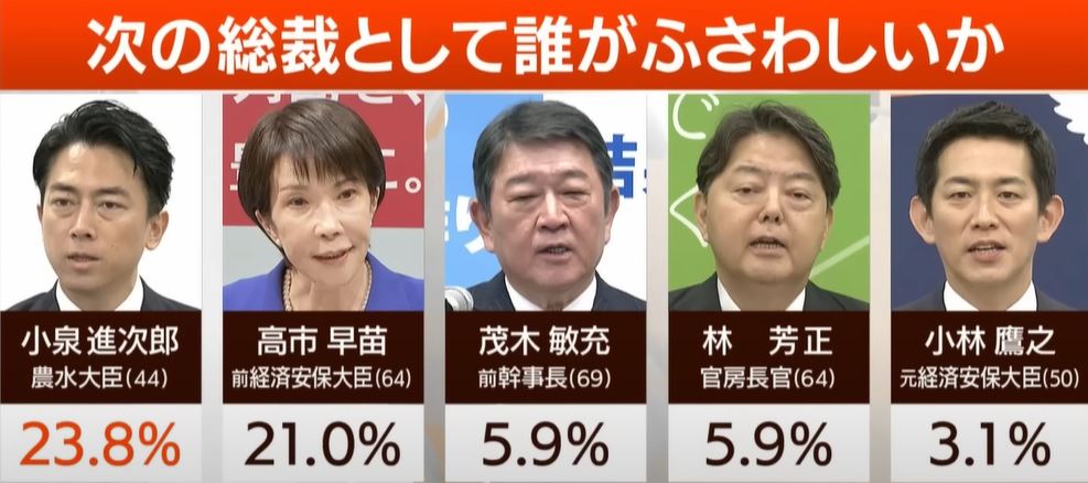 まず注目すべきは、世論調査と自民党内の情勢のギャップです。全国的には「次期総裁にふさわしい人物」として高市氏の名前が挙がるものの、自民党議員の間では必ずしも支持が広がっていません。むしろ、議員票の多くは林芳正氏や小泉進次郎氏に流れており、高市氏は組織票を取り込みにくい状況に陥っています。